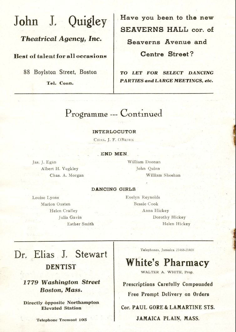 Editor’s Note: The JPHS doesn’t condone the racial stereotypes of minstrel shows. However, we present this program as a snapshot of attitudes and retail establishments in Jamaica Plain in 1913. For more on the history of blackface and minstrel shows in America we encourage you to read this article from the National Museum of African American History & Culture https://nmaahc.si.edu/explore/stories/blackface-birth-american-stereotype