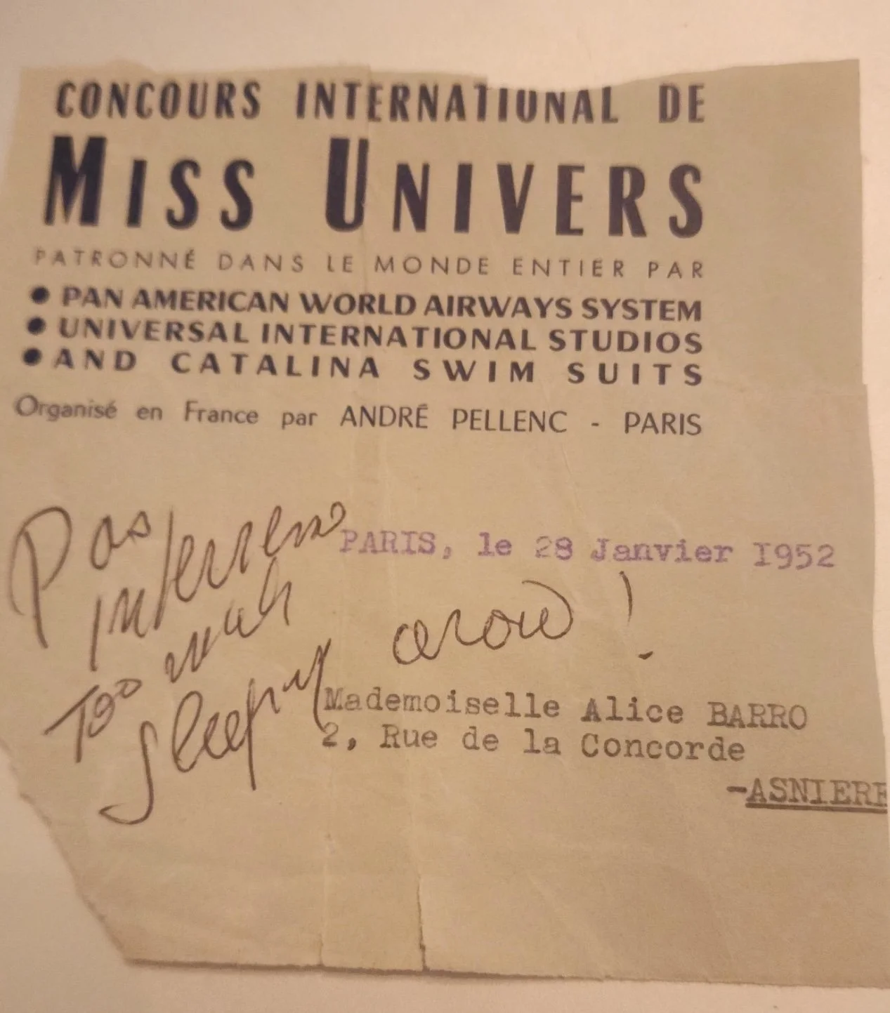 Carole: Mom was also asked to compete in the Miss Universe contest. She got an invitation in 1952 (the first event was in 1952). Mom declined as she did not like the idea of beauty pageants.