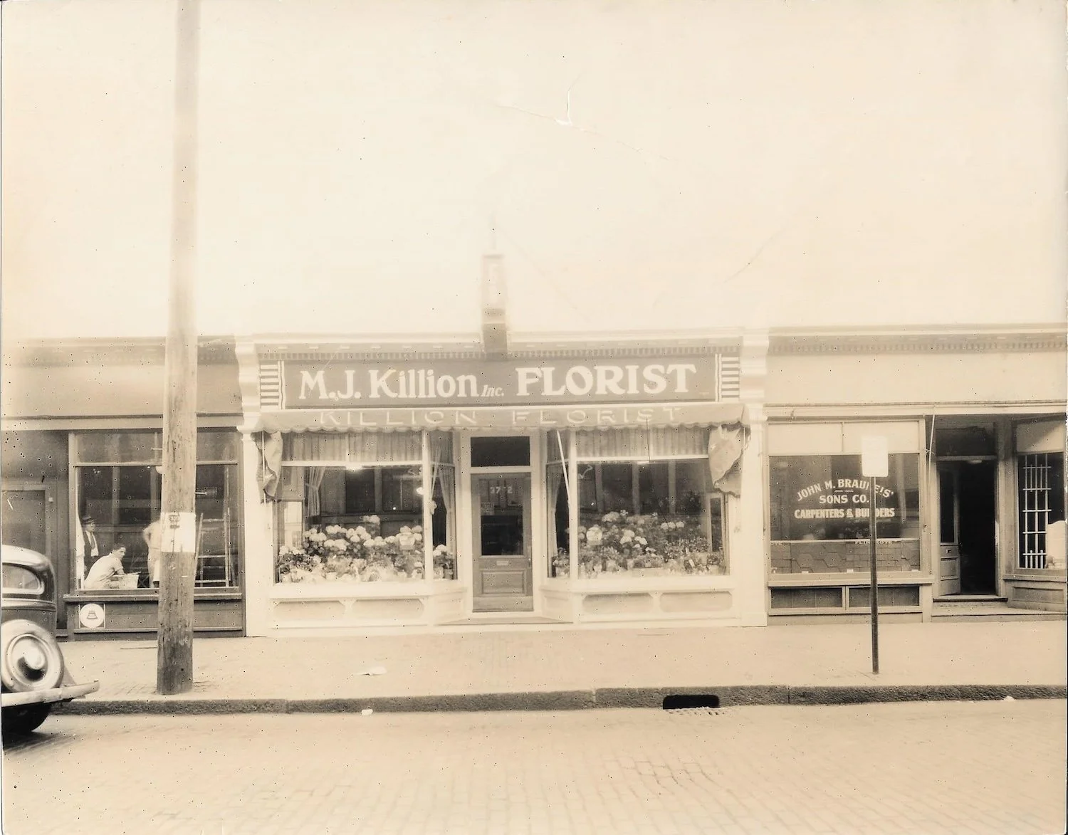 John M. Brauneis' Sons. Co., Carpenters & Builders (to the right of M.J. Killion Florist). Picture dated July 1937.